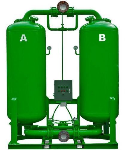 Принцип работы адсорбционных осушителей заключается в пропускании сжатого воздуха через ёмкость (колонну), в которой находится адсорбирующее вещество. Данный адсорбент впитывает влагу из проходящего сжатого воздуха. Когда колонна заполнена влагой, сжатый воздух по переключению клапана, начинает подаваться в следующую сухую колонну с адсорбентом. В это время заполненная колонна осушается с помощью выдува конденсата из адсорбента, частью воздуха от компрессора.