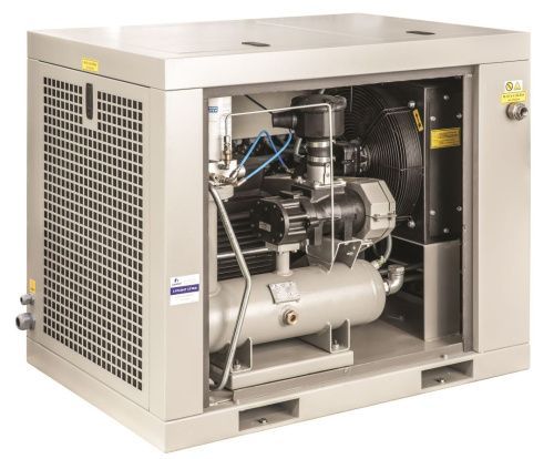 Винтовой воздушный компрессор Lupamat серии MI с воздушным охлаждением и впрыском масла. Конструкция представлена в виде звукоизолированной кабины, установленной на шасси поверх резиновых колодок, и представлен винтовым блоком, электродвигателем с клиноременной передачей и воздушным охлаждением. Предусматривает непрерывный режим работы и используется во многих секторах промышленности.