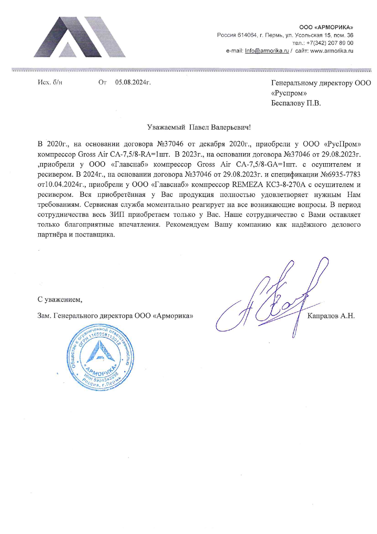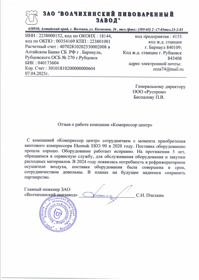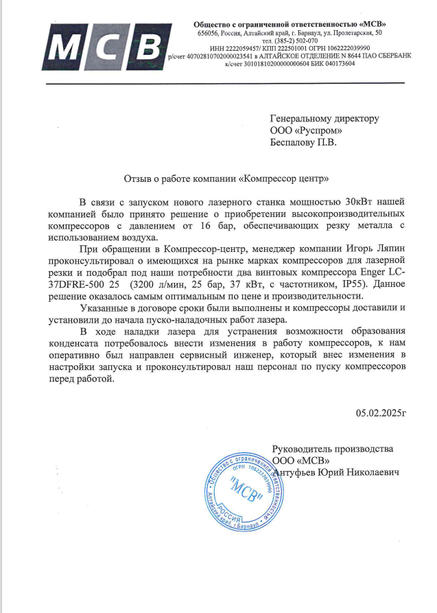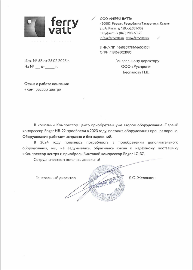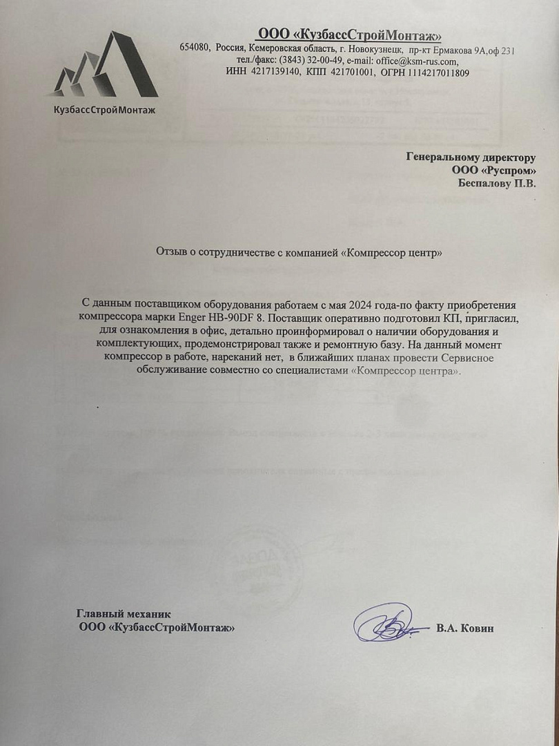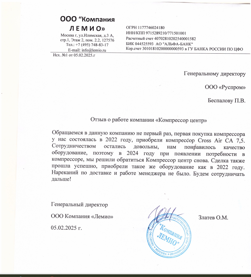 В 2020г., на основании договора №37046 от декабря 2020г., приобрели у ООО "РусПром" компрессор Cross Air CA-7,5/8-RA=1шт. В 2023г. на основании договора№37046 от 29.08.2023г., приобрели у ООО "Главснаб" компрессор Cross Air CA-7,5/8-GA=1шт. с осушителем и ресивером. в 2024г., приобрели у ООО "Главснаб" компрессор REVEZA KC3-8-270A с осушителем и ресивером. Вся приобретённая у Вас продукция полностью удовлетворят нужным Нам требованиям. Сервисная служба моментально реагирует на все возникающие вопросы. В период сотрудничества весь ЗИП приобретаем только у Вас. Наше сотрудничество с Вами оставляет только благоприятные впечатления. Рекомендуем Вашу компанию как надежного делового партнера и поставщика.