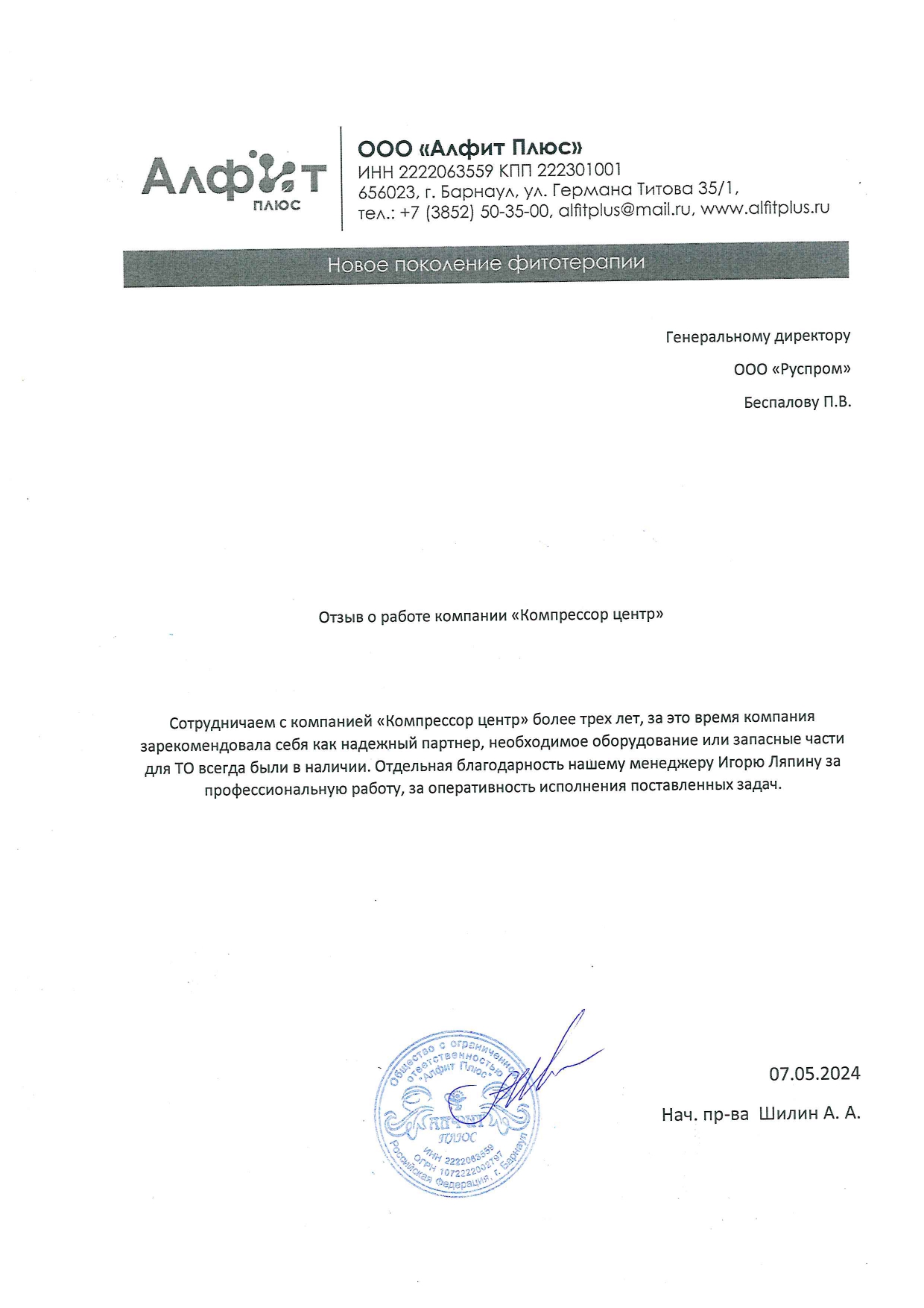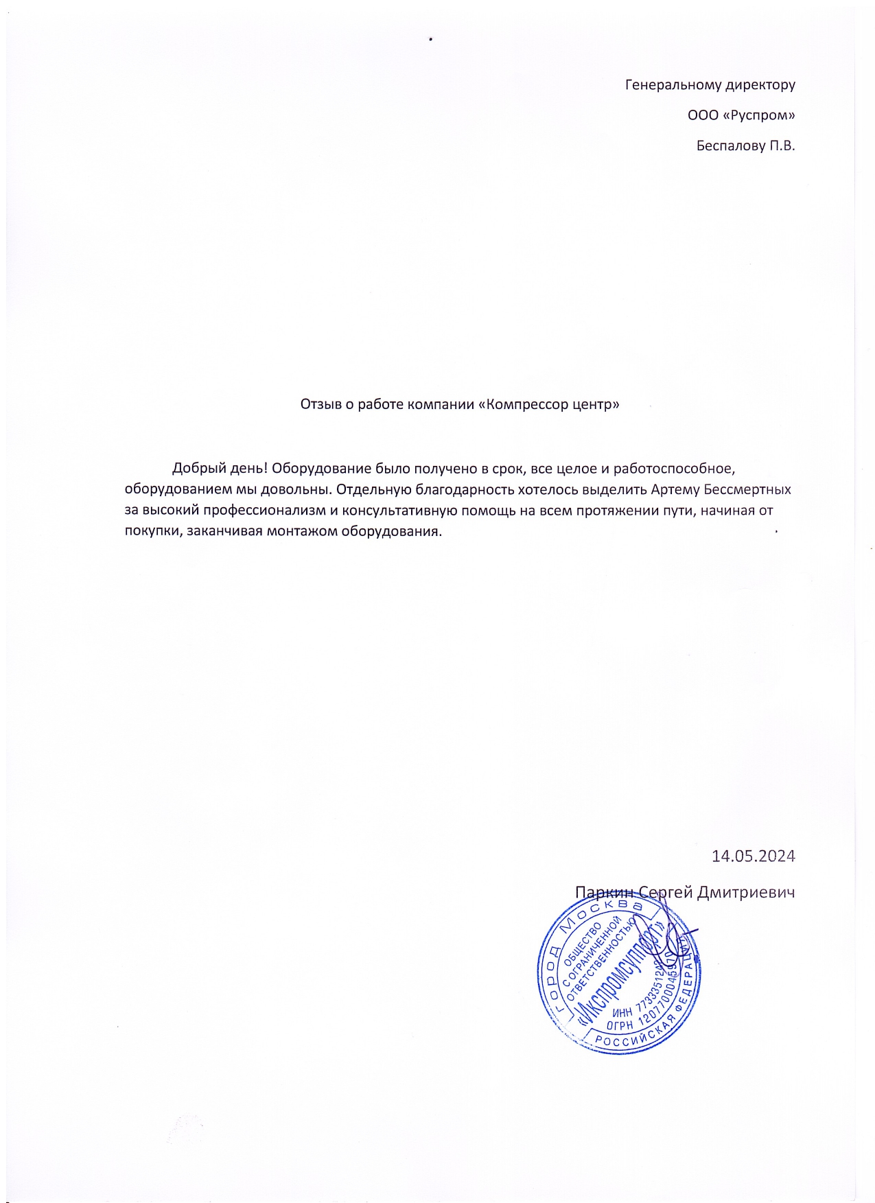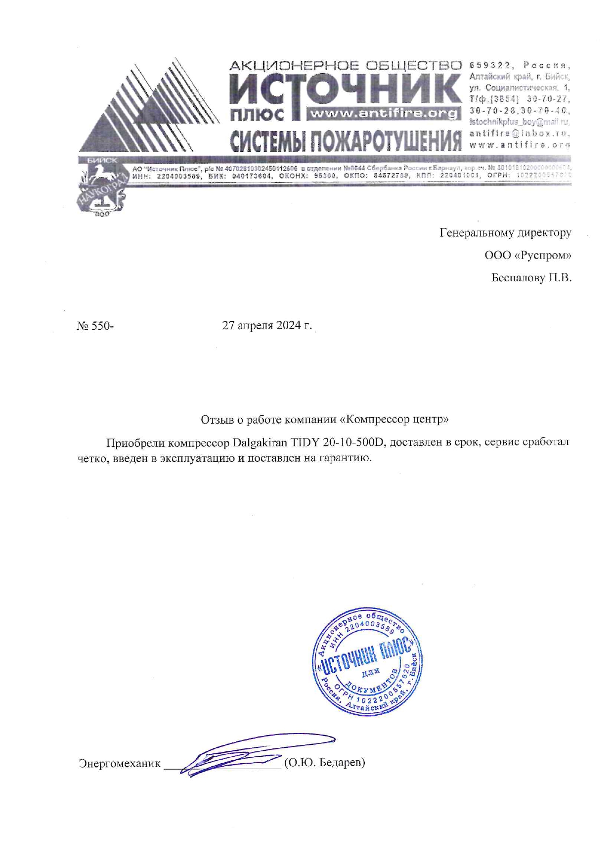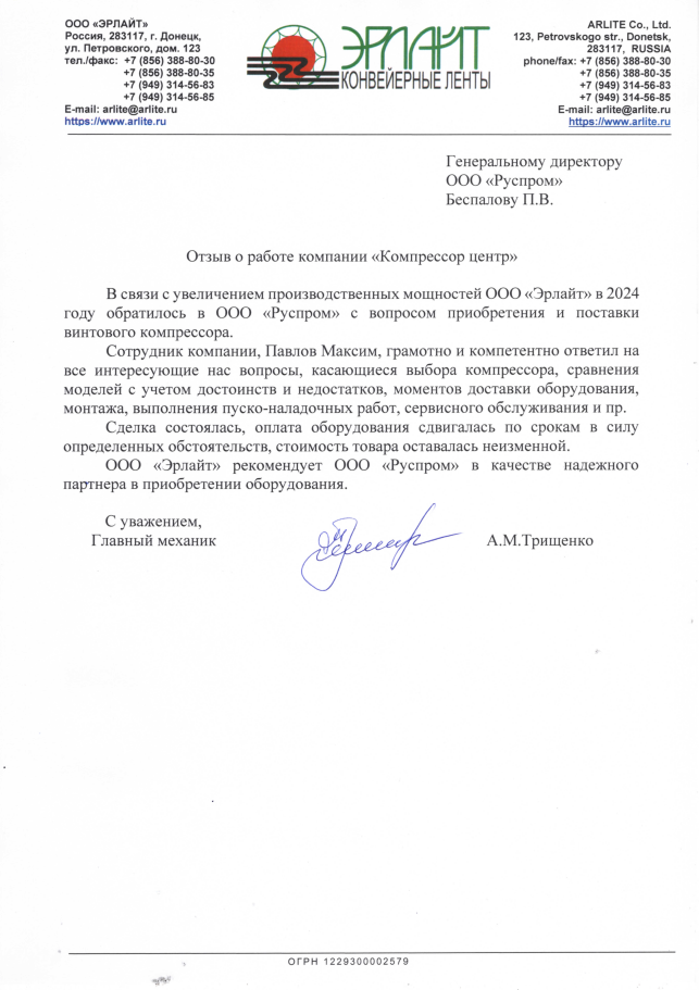 В 2020г., на основании договора №37046 от декабря 2020г., приобрели у ООО "РусПром" компрессор Cross Air CA-7,5/8-RA=1шт. В 2023г. на основании договора№37046 от 29.08.2023г., приобрели у ООО "Главснаб" компрессор Cross Air CA-7,5/8-GA=1шт. с осушителем и ресивером. в 2024г., приобрели у ООО "Главснаб" компрессор REVEZA KC3-8-270A с осушителем и ресивером. Вся приобретённая у Вас продукция полностью удовлетворят нужным Нам требованиям. Сервисная служба моментально реагирует на все возникающие вопросы. В период сотрудничества весь ЗИП приобретаем только у Вас. Наше сотрудничество с Вами оставляет только благоприятные впечатления. Рекомендуем Вашу компанию как надежного делового партнера и поставщика.