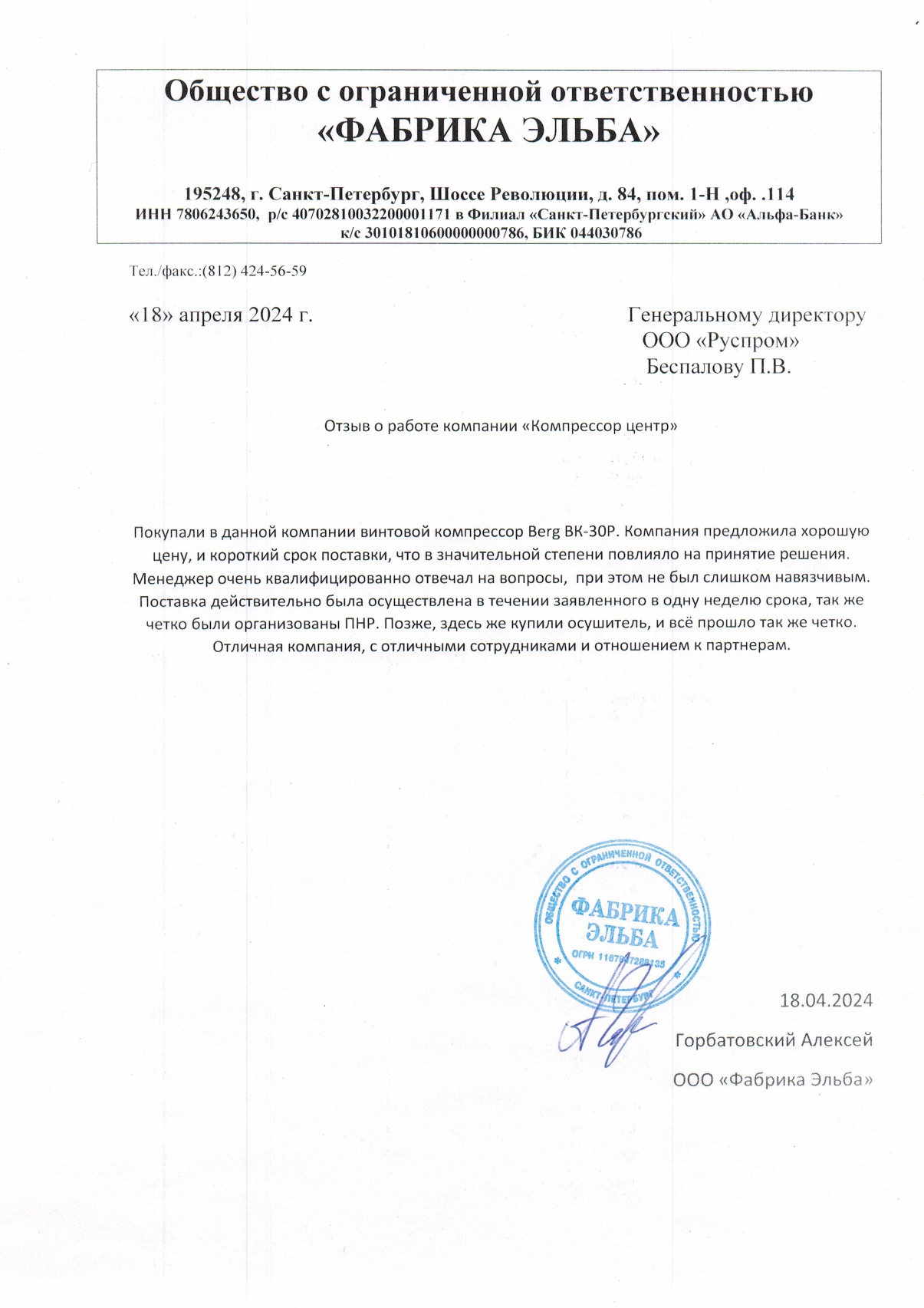 Горбатовский Алексей, ООО «Фабрика Эльба»