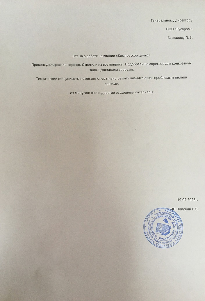 Нашей компании для работы требовался надёжный компрессор. При мониторинге и изучении огромного рынка, были направлены запросы на поставку компрессора в разные компании, в конечном итоге мы остановились на компании ООО "РусПром" ("Компрессор Центр").