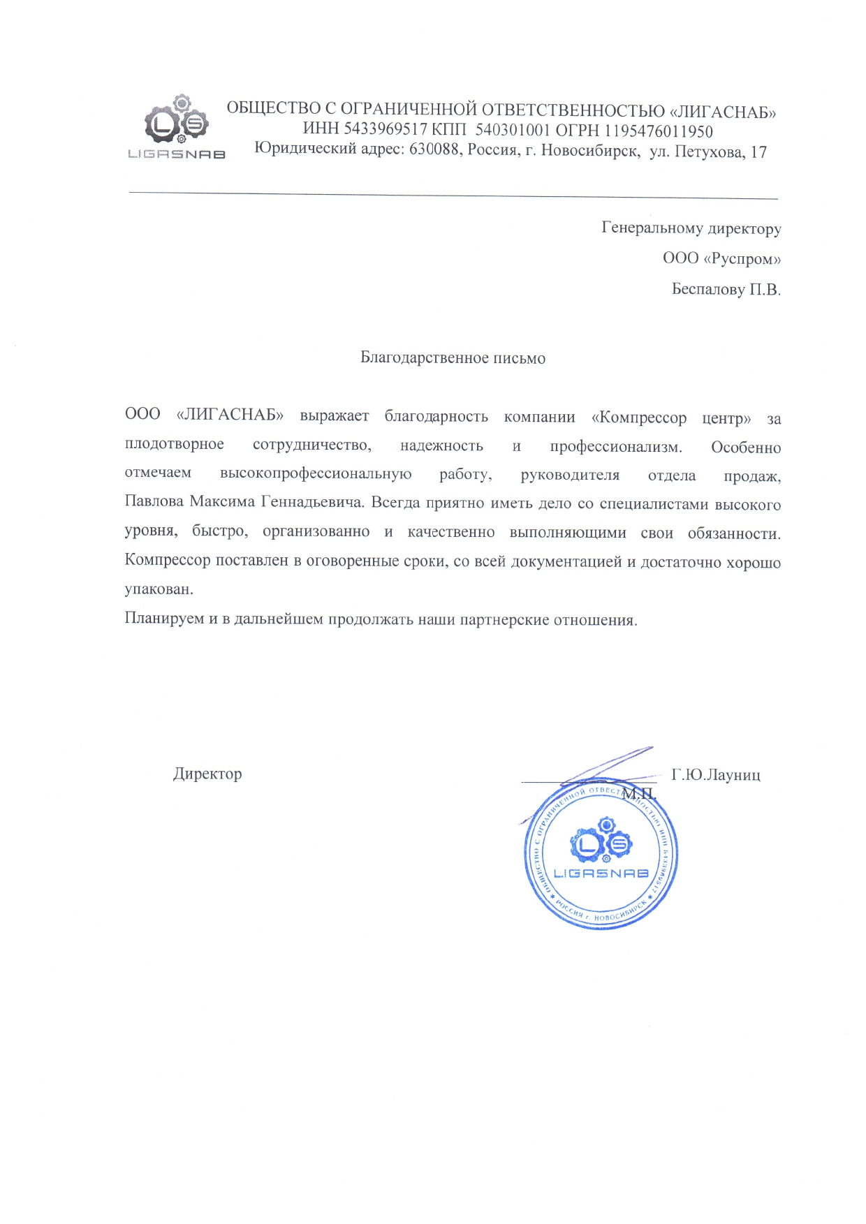 ООО "ЛИГАСНАБ" выражает благодарность компании "Компрессор центр" за плодотворное сотрудничество, надежность и профессионализм. Особенно отмечаем высокопрофессиональную работу, руководителя отдела продаж, Павлова Максима Геннадьевича. Всегда приятно иметь дело со специалистами высокого уровня, быстро, организованно и качественно выполняющими свои обязанности. Компрессор поставлен в оговоренные сроки, со своей документацией и достаточно хорошо упакован.