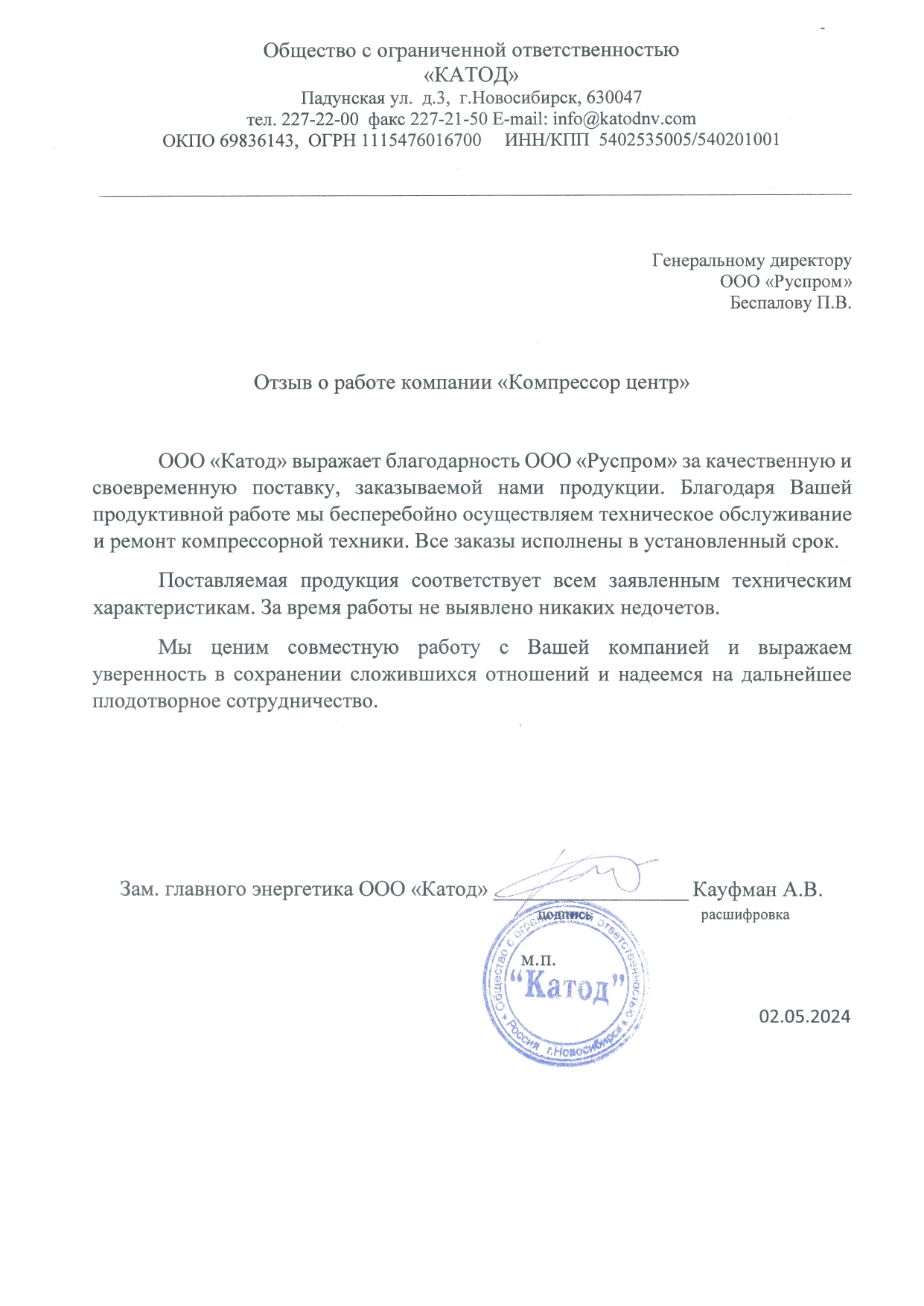 ООО "Катод" выражает благодарность ООО "Руспром" за качественную и своевременную поставку, заказываемой нами продукции. Благодаря Вашей продуктивной работе мы бесперебойно осуществляем техническое обслуживание и ремонт компрессорной техники. Все заказы исполнены в установленный срок.